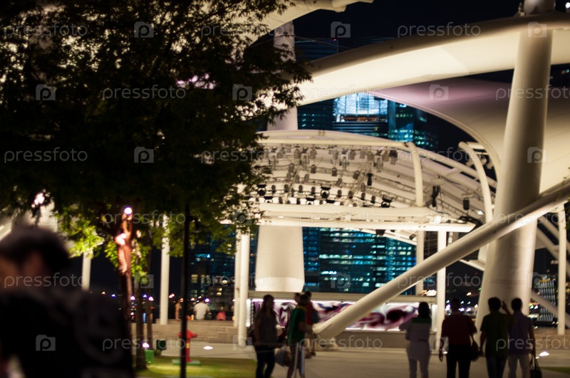 Люди, гуляющие в гавани по ночному ярко освещенному Сингапур