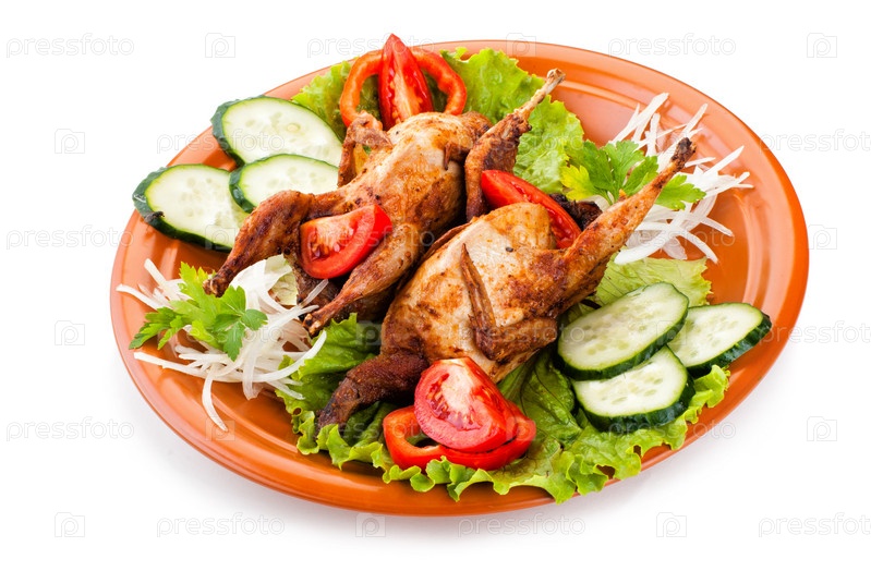 Перепела с огурцом, томатами и луком