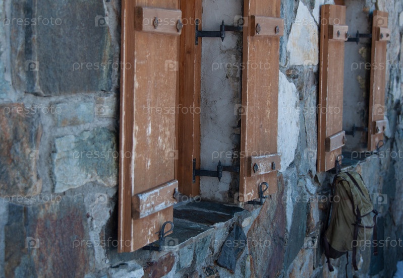 Старый каменный дом в австрийских Альпах с рюкзаком, висящем на оконной ставне