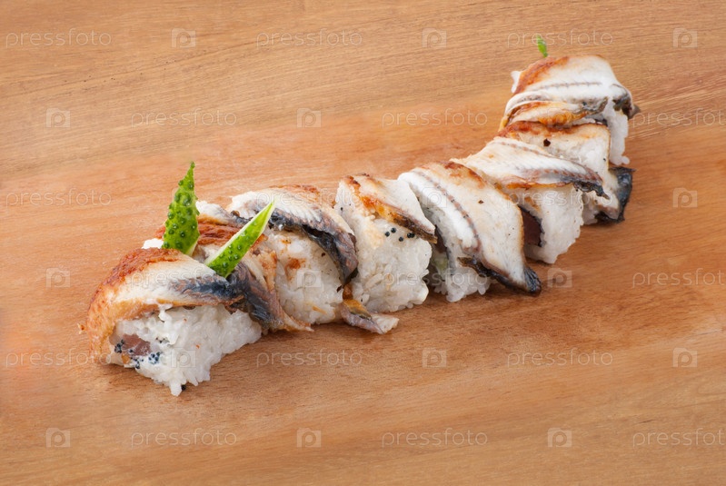 Японские суши с угрем на деревянной тарелке