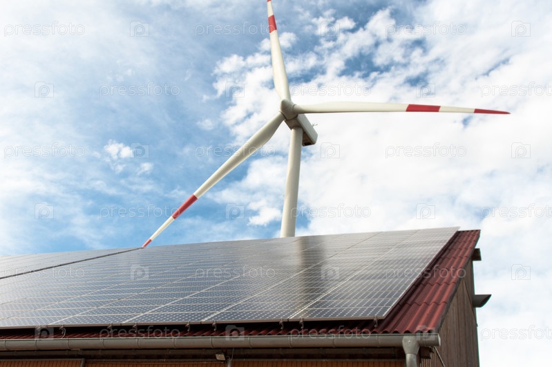 Сарай, покрытый солнечными панелями и ветряная турбина