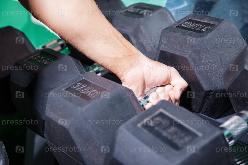 Рука человека держит тяжелую гантель