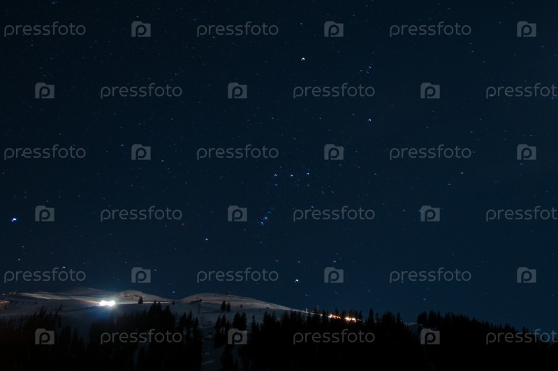 Ночная панорама гор Монтафон, Австрия, с ратраком, прокладывающим лыжню