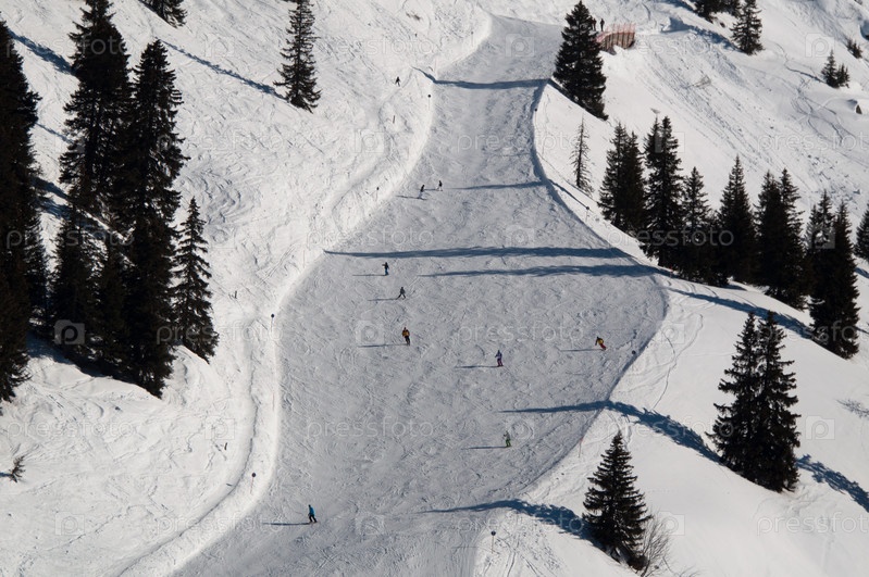 Горнолыжная трасса, окруженная деревьями, в солнечный день в горах Монтафон, Австрия