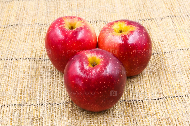 Свежие красные яблоки на мешке