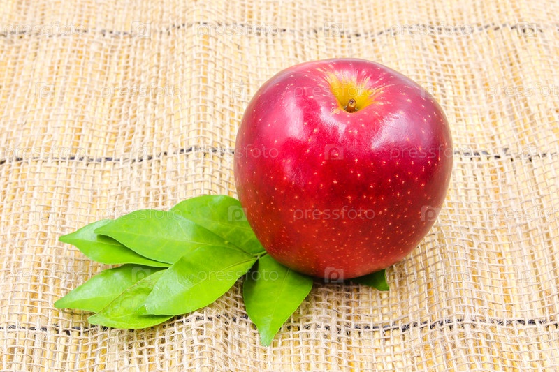 Свежие красные яблоки на мешке