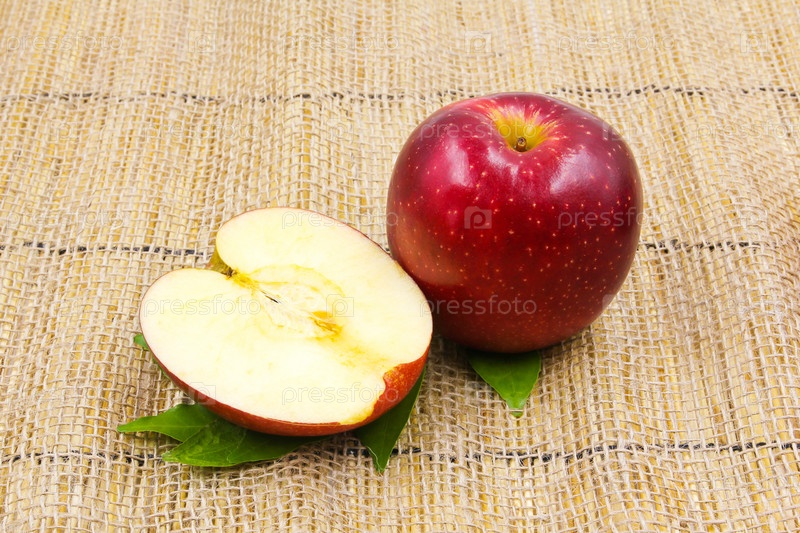 Свежие красные яблоки на мешке