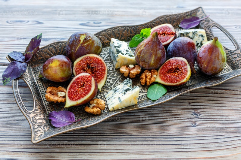 Свежий инжир с голубым сыром на бронзовом подносе