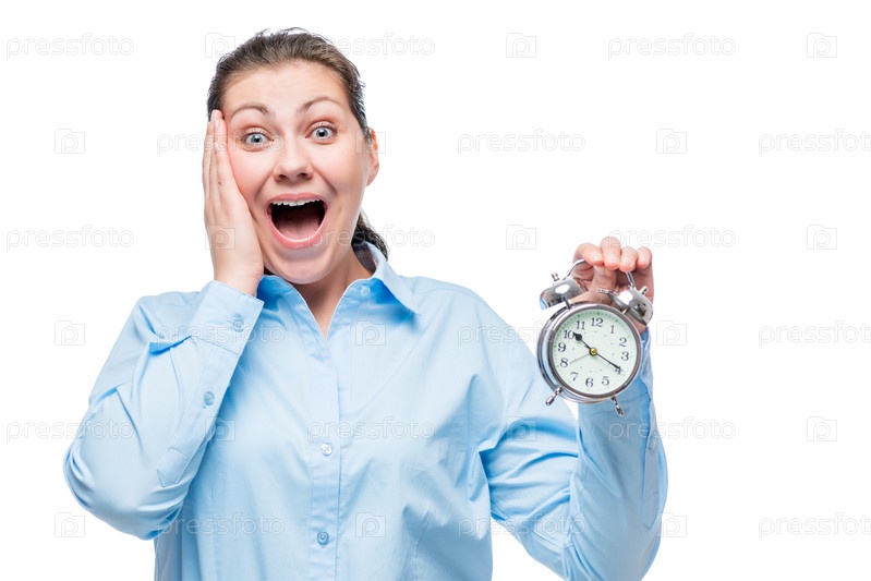 Эмоциональная бизнес-леди с будильником