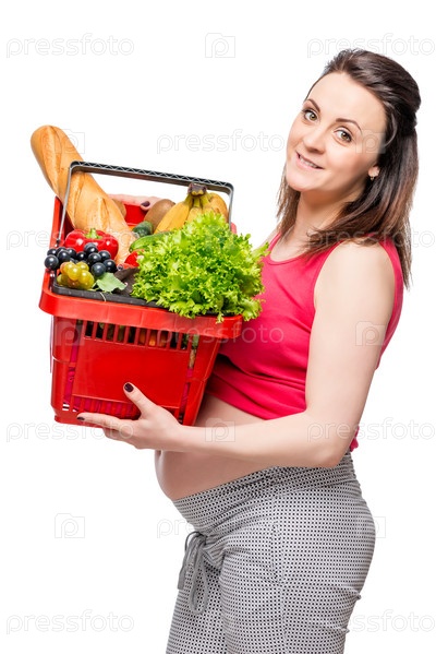 Портрет беременной женщины с корзиной полезных продуктов