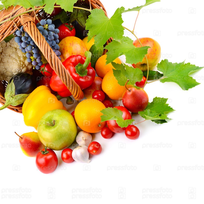 Овощи и фрукты в корзине на белом фоне