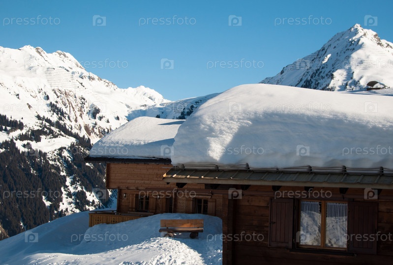 Небольшие деревянные хижины, покрытые снегом в горах Монтафон, Австрия