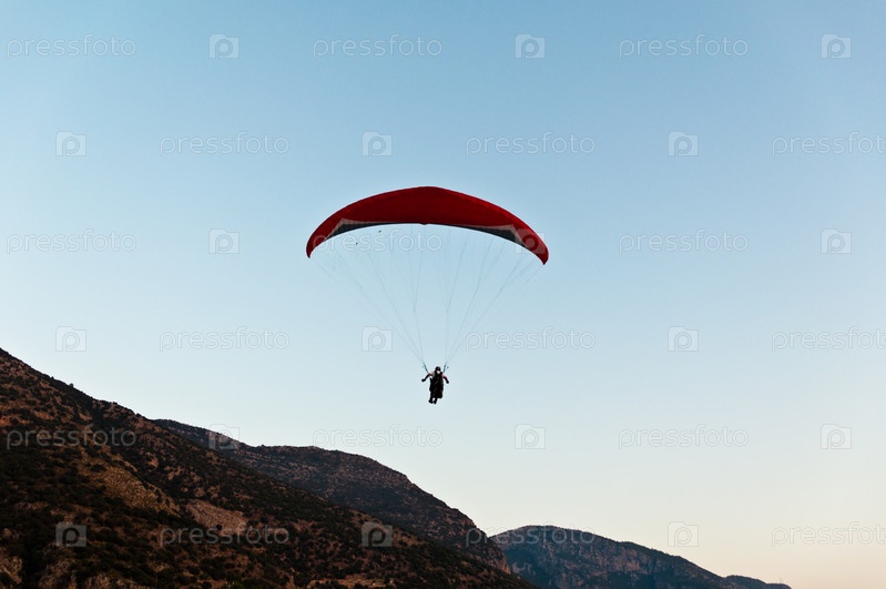 Парапланерист над Олуденизом вблизи Фетхие в чудесном закатном свете, Турция