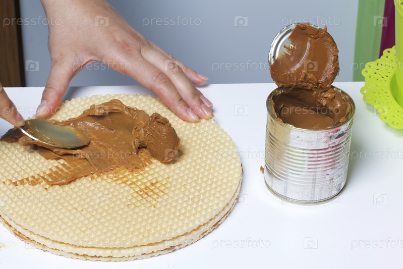 Женщина смазывает сгущенным молоком вафельный торт