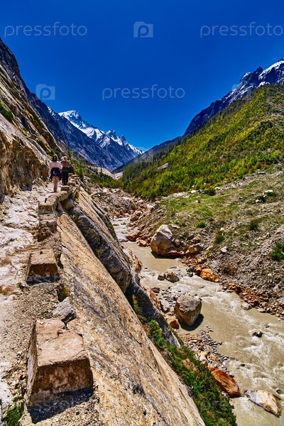 Проселочная дорога в горах с людьми. Гималаи, Уттаракханд, Ганготри, Индия