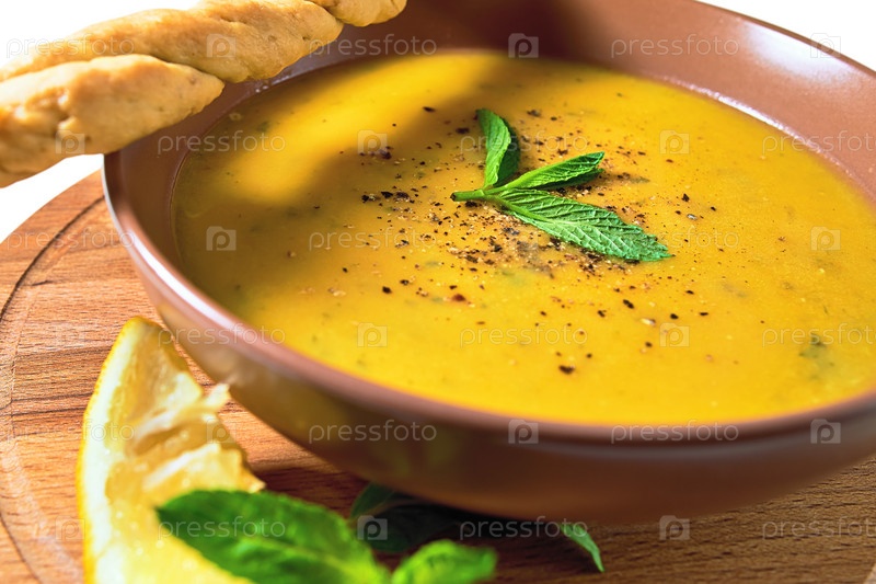 Турецкий крем-суп из чечевицы с мятой, лимоном и домашним хлебом