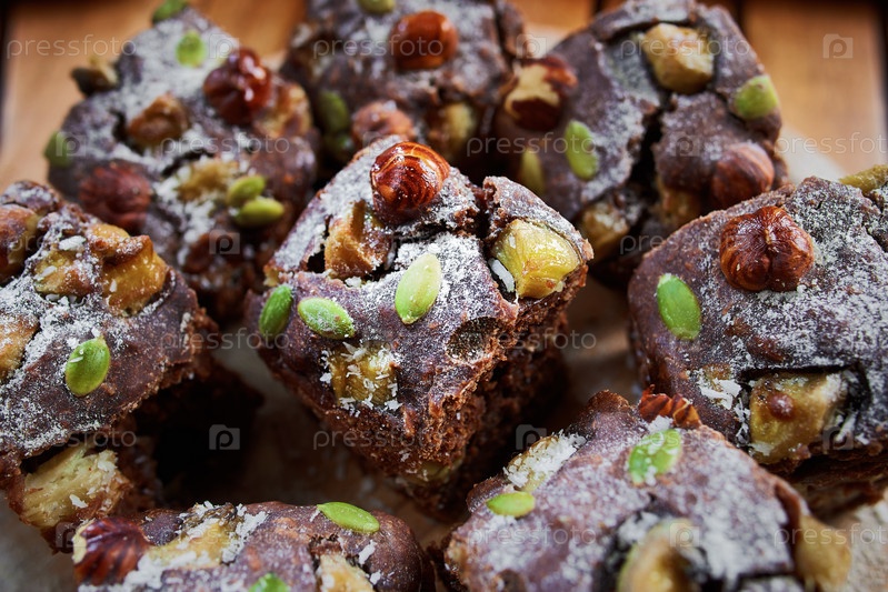 Кусочки шоколадного торта с орехами