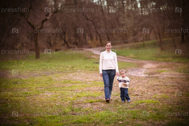 Молодая мать с сыном в осеннем парке