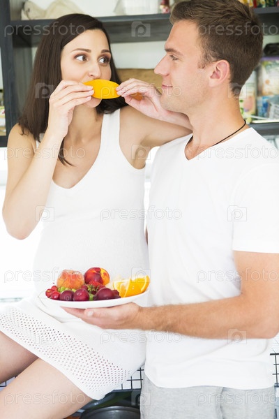 Молодой человек и беременная женщина с фруктами