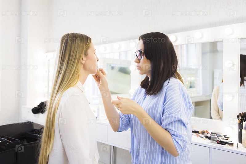 Молодой визажист делает макияж для красивой модели