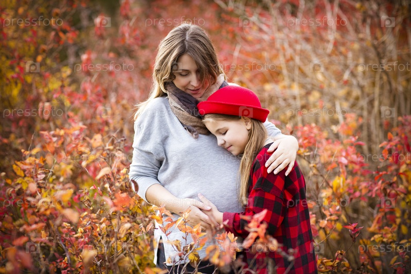 Счастливая молодая беременная мать с дочерью в осеннем парке