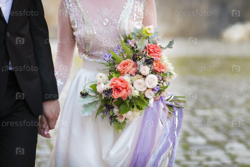 Молодые жених и невеста, держась за руки