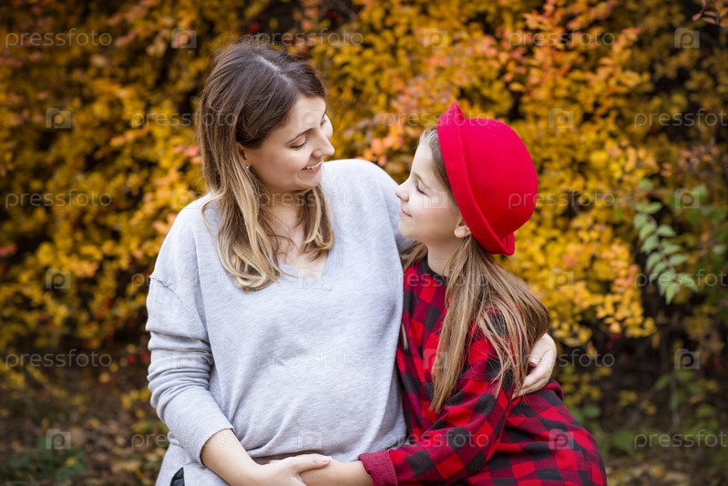 Счастливая молодая беременная мать с дочерью в осеннем парке