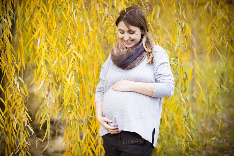 Счастливая молодая беременная женщина в осеннем парке