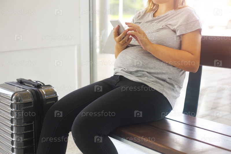 Молодая беременная женщина с чемоданом в аэропорту