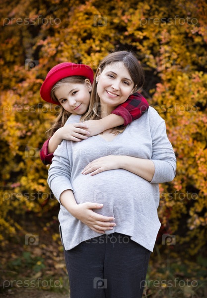 Счастливая молодая беременная мать с дочерью в осеннем парке