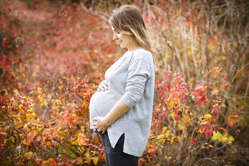 Счастливая молодая беременная женщина в осеннем парке