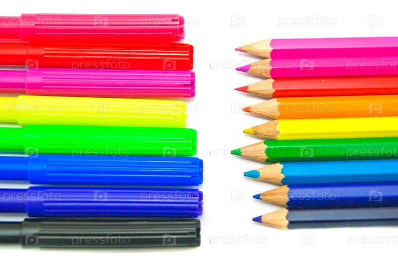 Фломастеры и карандаши крупным планом на белом фоне
