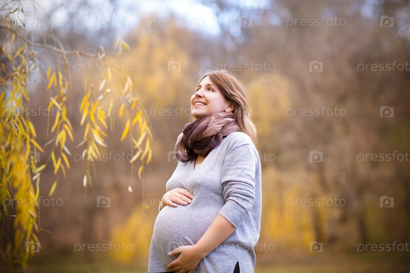 Счастливая молодая беременная женщина в осеннем парке