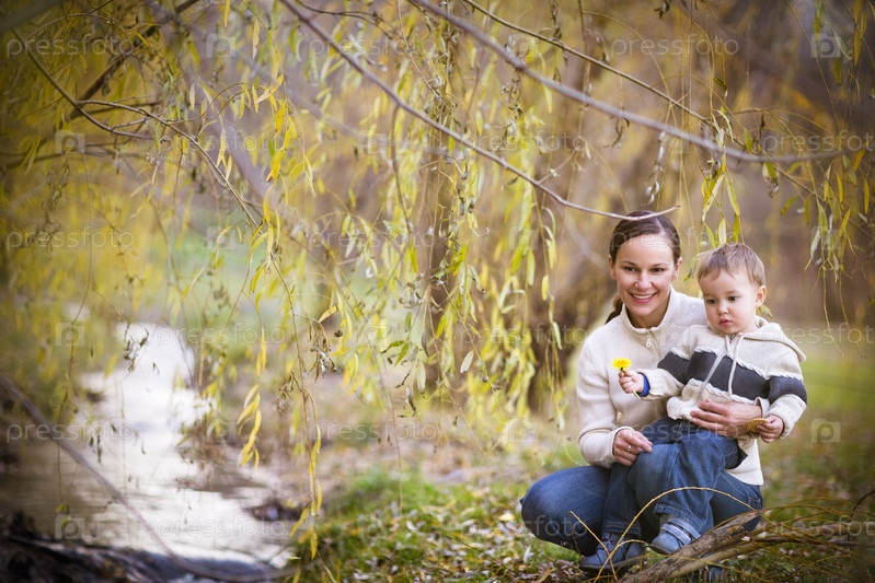 Молодая мать с сыном в осеннем парке