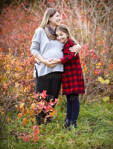Счастливая молодая беременная мать с дочерью в осеннем парке