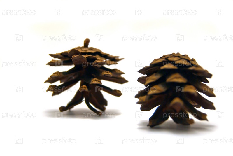 Две сосновые шишки крупным планом на белом фоне