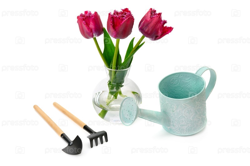 Тюльпаны и садовое оборудование, изолированные на белом фоне