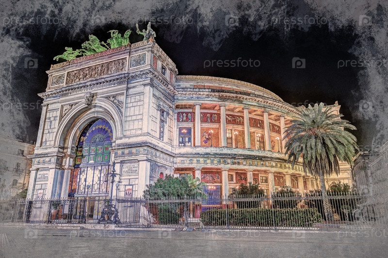 Ночной вид на театр Политеама Гарибальди в Палермо