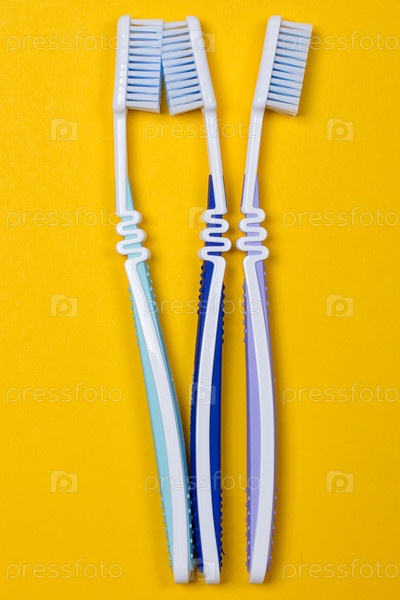 Три зубные щетки на желтом фоне