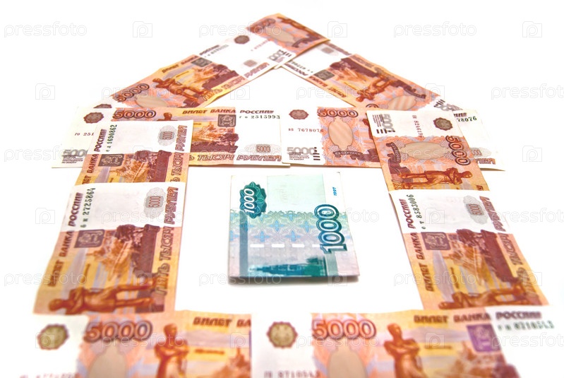 Дом из российских рублей на белом фоне