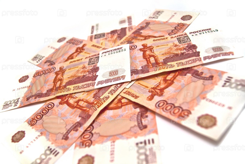Банкноты достоинством 5000 рублей на белом фоне