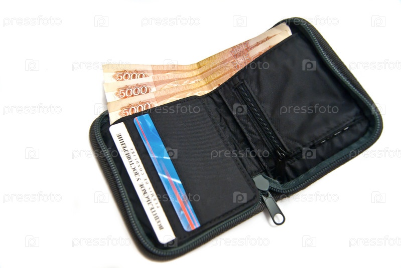 Водительское удостоверение и деньги в бумажнике на белом фоне