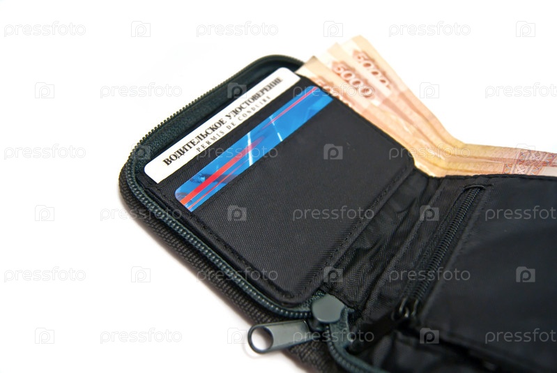Водительское удостоверение и деньги в бумажнике на белом фоне