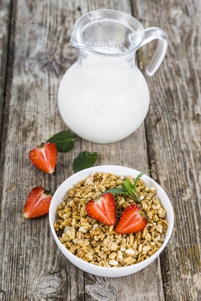 Мюсли и кувшин молока на завтрак