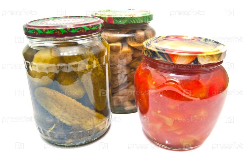 Банки с домашними заготовками на белом фоне