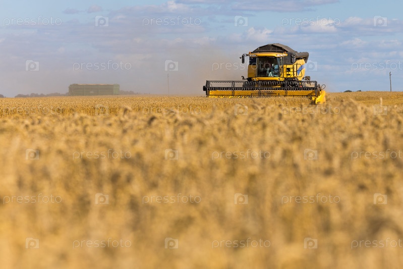 Желтый комбайн на пшеничном поле с голубым небом