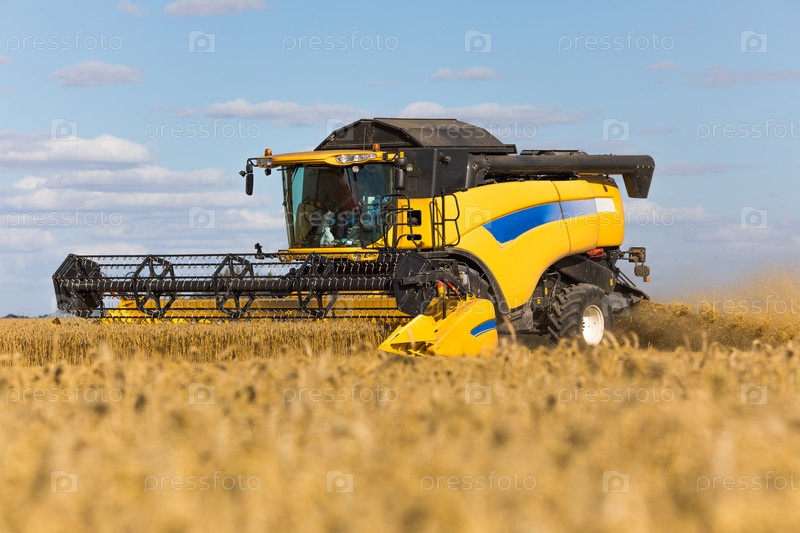 Желтый комбайн на пшеничном поле с голубым небом