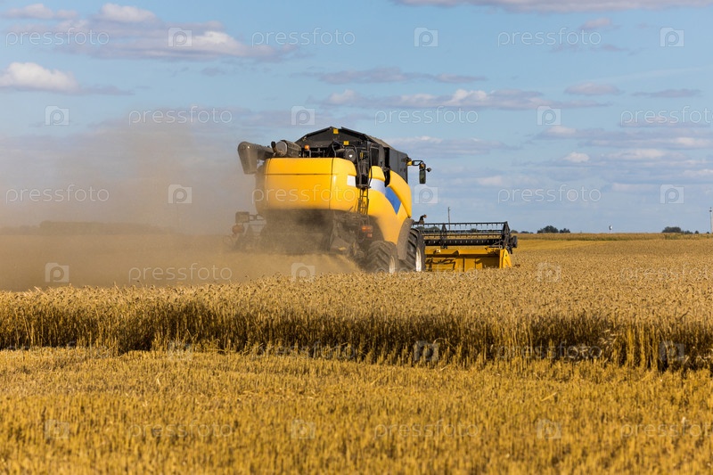 Желтый комбайн на пшеничном поле с голубым небом