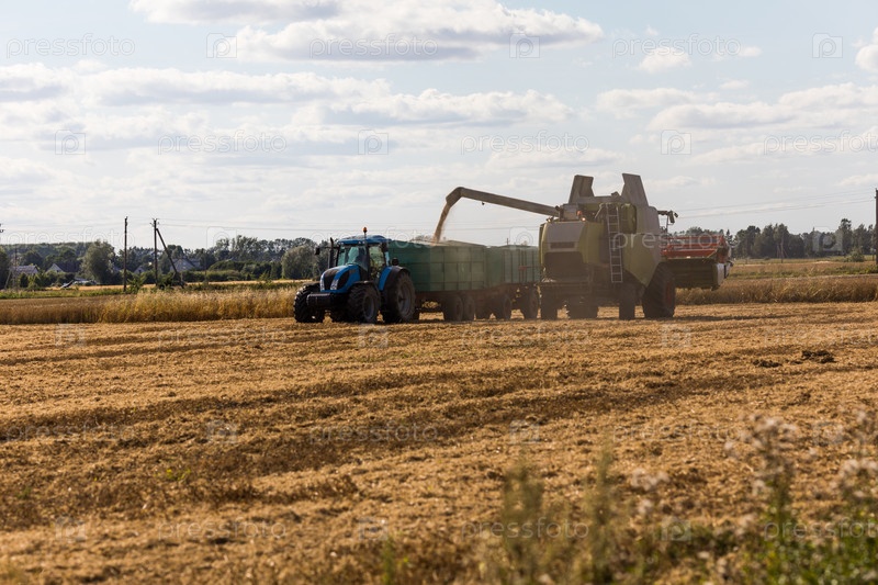 Зерноуборочный комбайн на пшеничном поле с трактором