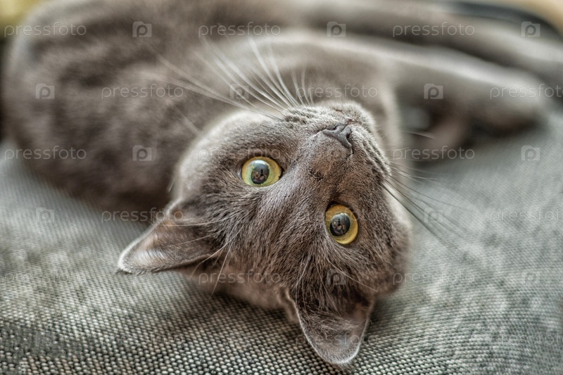 Русский голубой кот лежит на спине